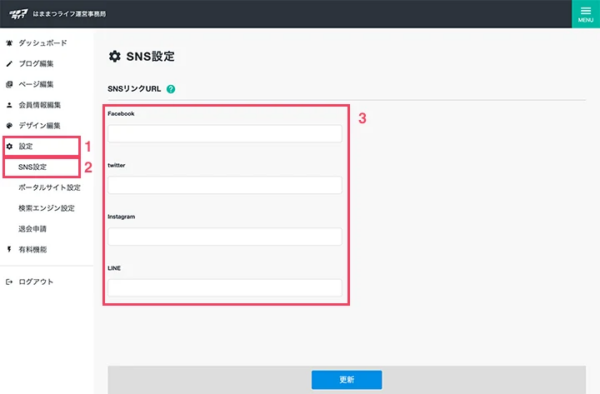 各SNSのリンク先アドレスを入力。入力したボタンだけが表示されます。