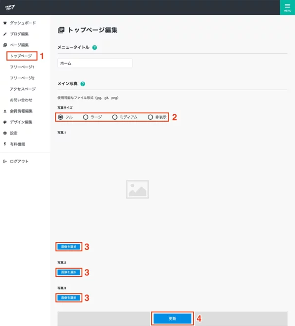 - 左メニューの「ページ編集」内にある「トップページ」をクリックします。
