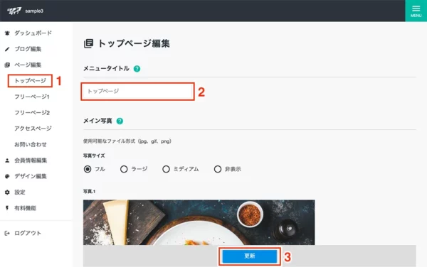 - 左メニューの「ページ編集」内にある「トップページ」をクリック。