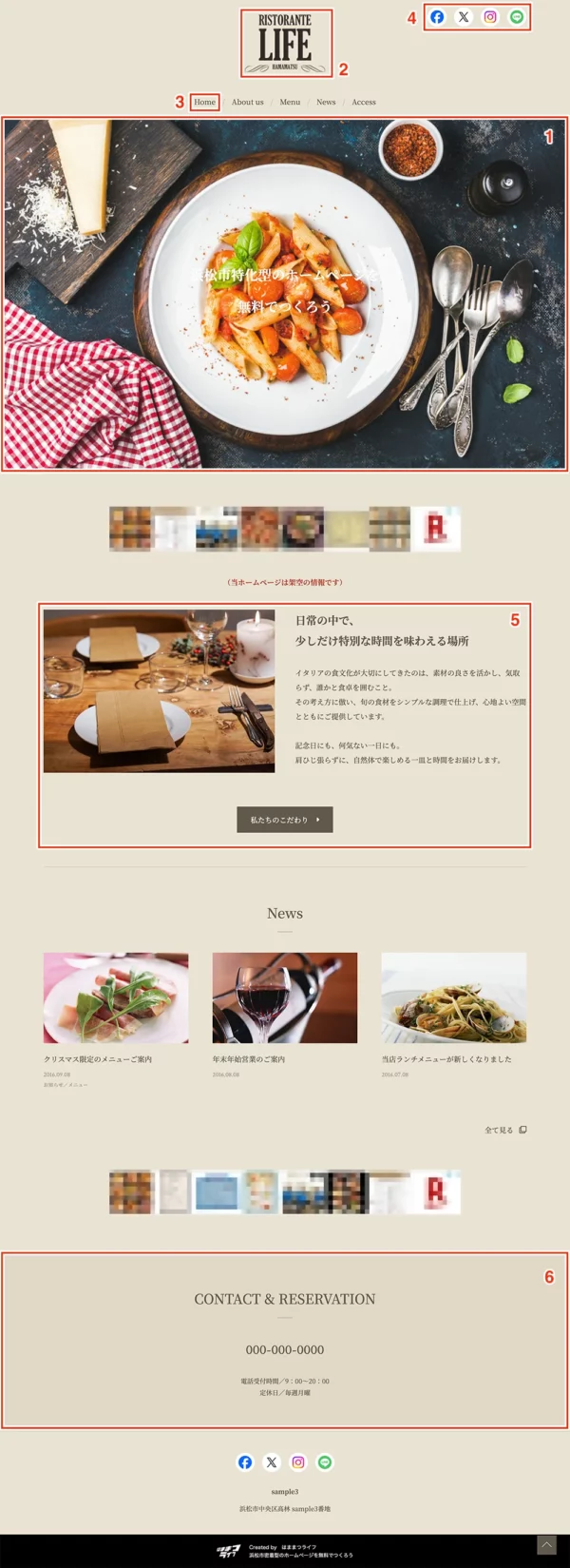 トップページはアドレス(https://◯◯◯◯.hamamatsu.life)にアクセスした時に、最初に表示されるページです。トップページの構成パーツ1〜6の設定方法を順を追ってご説明します。
