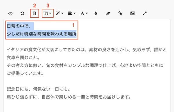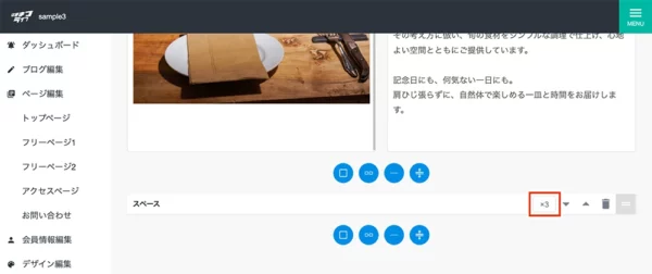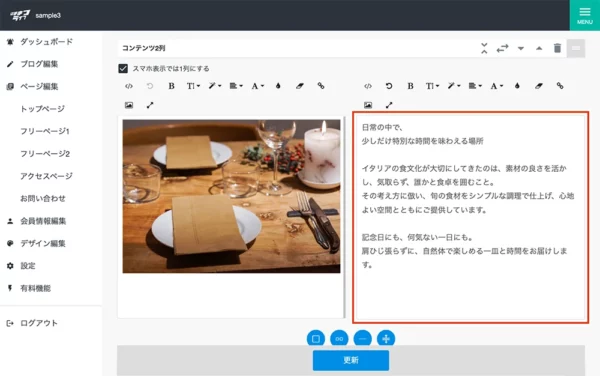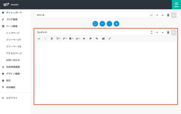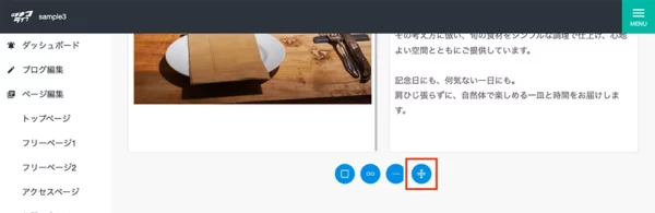 フリーエリアはコンテンツ(テキストや写真)のブロックを積み上げるようにしてページを作成します。(後に説明するフリーページの編集方法と同じです)