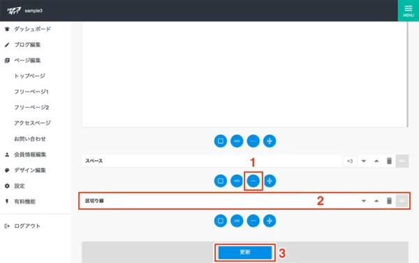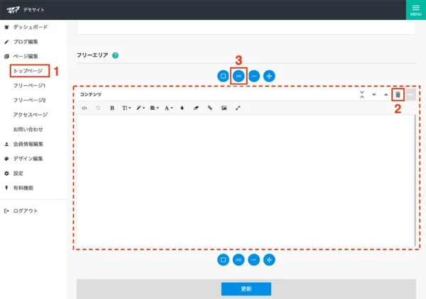- フリーエリア部分、初期状態で1列のコンテンツ入力エリアが表示されていますが、2列のコンテンツを作成したいので、一旦削除します。