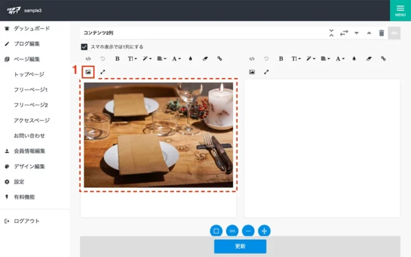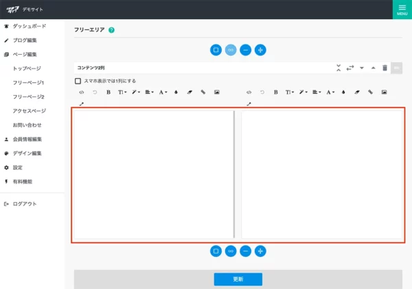 - 「コンテンツ2列」ボタンをクリックして、2列のコンテンツ入力エリアを追加します。