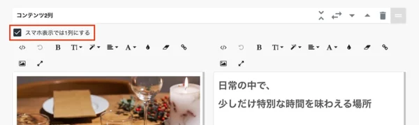 このチェックボックスを入れることで2列のコンテンツがスマホ表示では1列になります。