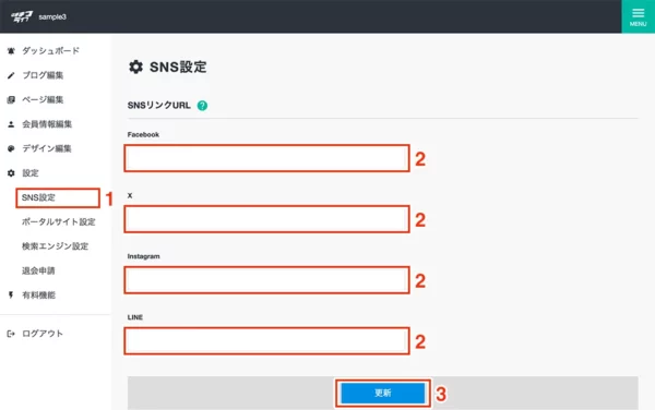 - 左メニューの「設定」内にある「SNS設定」をクリックします。