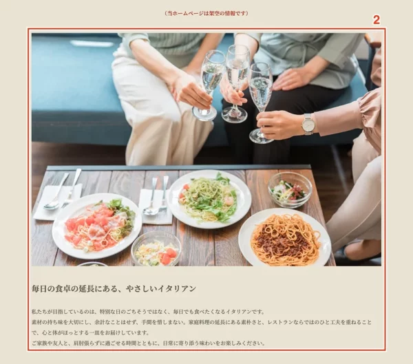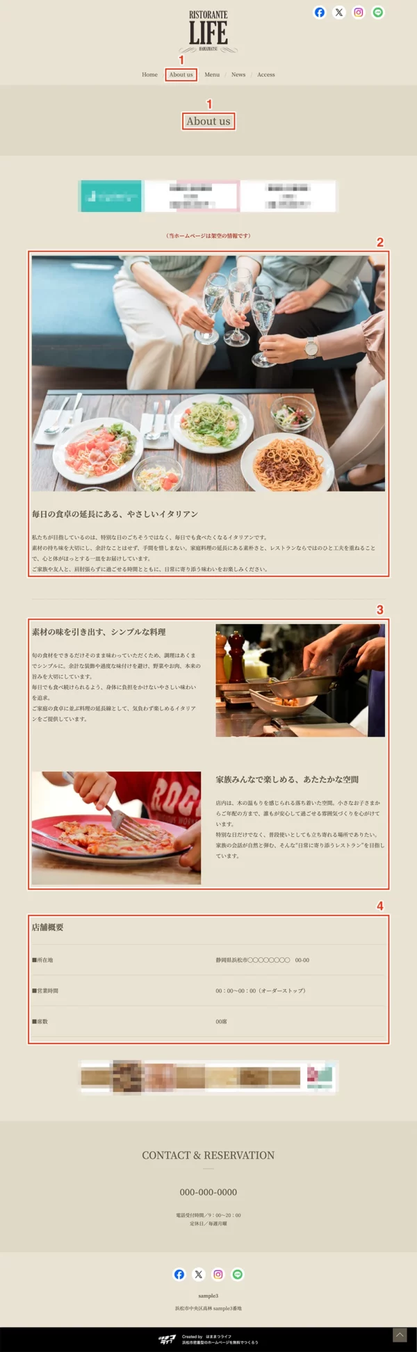 2ページ制作できるフリーページの1ページを使用して、店舗案内ページを制作します。お店の特徴や基本情報を掲載しています。