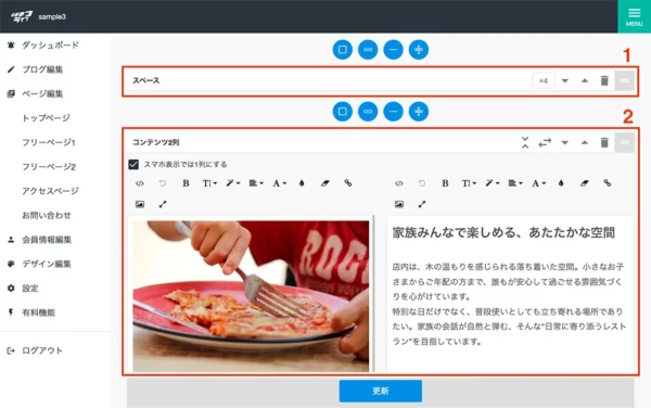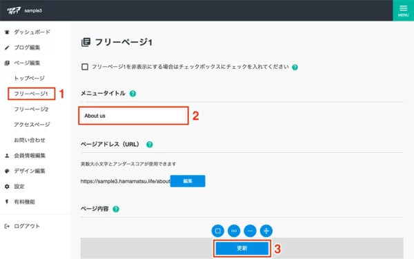 - 左メニューの「ページ編集」内にある「フリーページ1」をクリックします。
