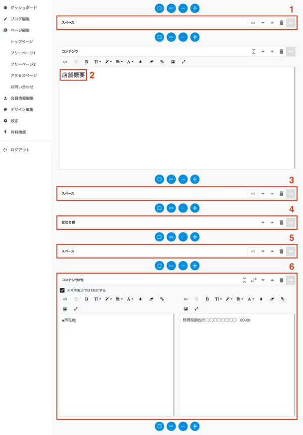 最後に「区切り線」と「コンテンツ2列」を使って店舗概要をリスト形式で制作します。