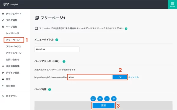 初期設定で「free」になっているページアドレス(URL)を任意のアドレスに変更できます。(使用できる文字は「英数大小文字とアンダースコア」のみです。)